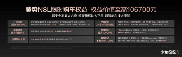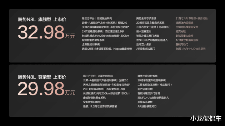 动力部分,腾势N8L是一款插电式混动车型,新车搭载了2.0T发动机+三电机,能够做到3.9s破百,纯电续航里程230km,综合续航里程更是达到了1300km。另外,值得一提的还有新车配备了后轮独立转向系统,所以最小转弯半径做到了4.58m,让车辆在狭窄道路也能更加灵活。